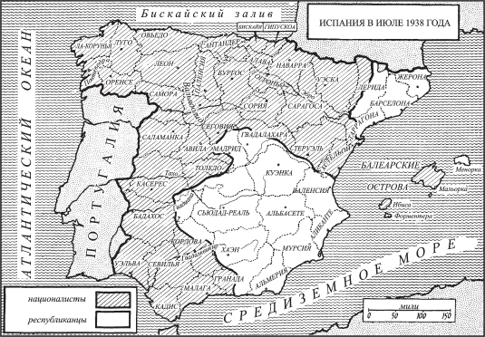 Тем временем наступление националистов в Маестрасго и вдоль побережья Средиземного моря продолжалось, но очень медленно. Силы республики под командой генерала Менендеса сопротивлялись умело и мужественно. Командир легиона «Кондор», генерал Фолькманн, сменивший Шперрле, сообщал, что материальная часть работает на пределе. Только 14 июня, после нескольких дней ожесточенных боев на подступах к Кастельону, что лежал в шестидесяти милях к югу от Винароса, Аранде удалось взять город. Сорок политических заключенных были расстреляны, и перед тем, как его покинули последние республиканские части, город отдан на разграбление. Националисты с гордостью сообщили о взятии большого портового города Эль-Грао-де-Кастелло. Теперь они стояли всего в пятидесяти милях к северу от Валенсии. Но когда до Сагунто оставалось пройти всего восемь миль к северу, военное противостояние зашло в тупик. Националистам к тому времени удалось добиться единственного успеха – генерал Ируретагойена взял анклав «Хитреца» в Валье-дель-Альто-Синка. 16 июня пал пиренейский город Бьельса. 4000 человек ушли во Францию. Французские власти опросили каждого из них: в какую часть Испании он хочет перебраться. 168 человек изъявили желание оказаться на стороне националистов.