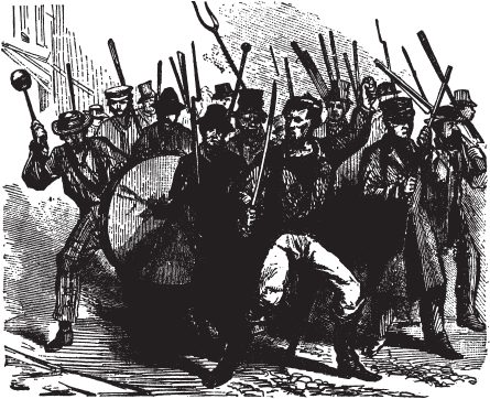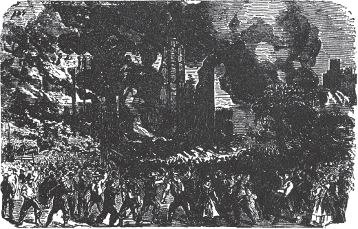 Понедельник выдался жарким и ясным. Около шести утра группы, состоящие как из мужчин, так и из женщин – жителей подвалов и трущоб нижней половины города, начали собираться в различных местах Вест-Сайда. Собравшись там в большом количестве, они двинулись на север по Восьмой и Девятой авеню. По дороге к толпе присоединялись рабочие и другой трудовой люд. Нескольких хозяев и мастеров, пытавшихся помешать этому, избили. Таким образом, пока респектабельная часть жителей города завтракала, толпа черни, вооруженная чем попало, собиралась на условленном месте – на пустыре к востоку от Центрального парка, где сейчас самый модный жилой район Нью-Йорка. По мере того как пустырь заполнялся народом, агитаторы разогревали толпу зажигательными речами против призыва, и около восьми утра огромная масса людей двинулась двумя колоннами по Пятой и Шестой авеню на юг, размахивая оружием и выкрикивая лозунги неповиновения правительству и полиции. На Сорок седьмой улице эти колонны соединились, повернули на восток и пошли в сторону Третьей авеню, а потом – вниз по этой широкой улице к призывному пункту на Сорок шестой улице. Численность толпы, по различным источникам, оценивается от 5 до 15 тысяч человек.
