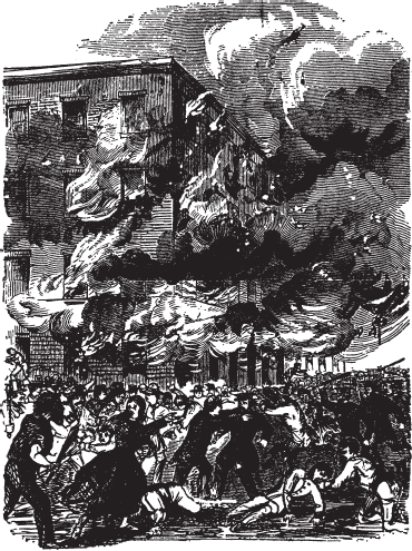 Едва успел последний страж порядка протиснуться в щель и покинуть арсенал, как двери рухнули и торжествующая чернь ворвалась в здание. Внизу у них было достаточно возможностей пограбить, но склад карабинов и боеприпасов находился на третьем этаже, куда и бросилась толпа. Через несколько минут комната была заполнена возбужденными мятежниками, которые выхватывали ружья из стойки и набивали карманы патронами. Чтобы полиция не помешала им, бандиты забаррикадировали дверь склада, что имело ужасные последствия. Пока шло разграбление арсенала, полицейским подразделениям, сражавшимся с мятежниками на Второй и Третьей авеню, удалось объединиться, и в количестве более 100 человек они бросились в атаку на толпу, которая все еще окружала площадь перед арсеналом. Их деревянные дубинки вскоре расчистили путь, и подразделение пробилось до самого входа в здание. Некоторые мятежники бросились из здания наружу на выручку своим, но полицейские дубинки сбивали их с ног. Некоторые были убиты сильными ударами. В это время другие бандиты, решив, что на этот раз у полиции хватит сил отбить арсенал, подожгли здание во многих местах. Дом был деревянным и очень старым, поэтому через десять минут первый этаж уже полыхал. Полиция больше не трогала выбегавших из здания, кроме тех, кто пытался вынести оружие или боеприпасы. Таких били нещадно. У запершихся на складе шансов спастись оставалось мало, они так хорошо забаррикадировались, что долго не могли сами открыть дверь, а когда в конце концов ее сорвали с петель, все здание ниже третьего этажа представляло собой один пылающий факел. Через мгновение мятежники уже прыгали в окна, но многие разбивались при падении насмерть или ломали руки и ноги.