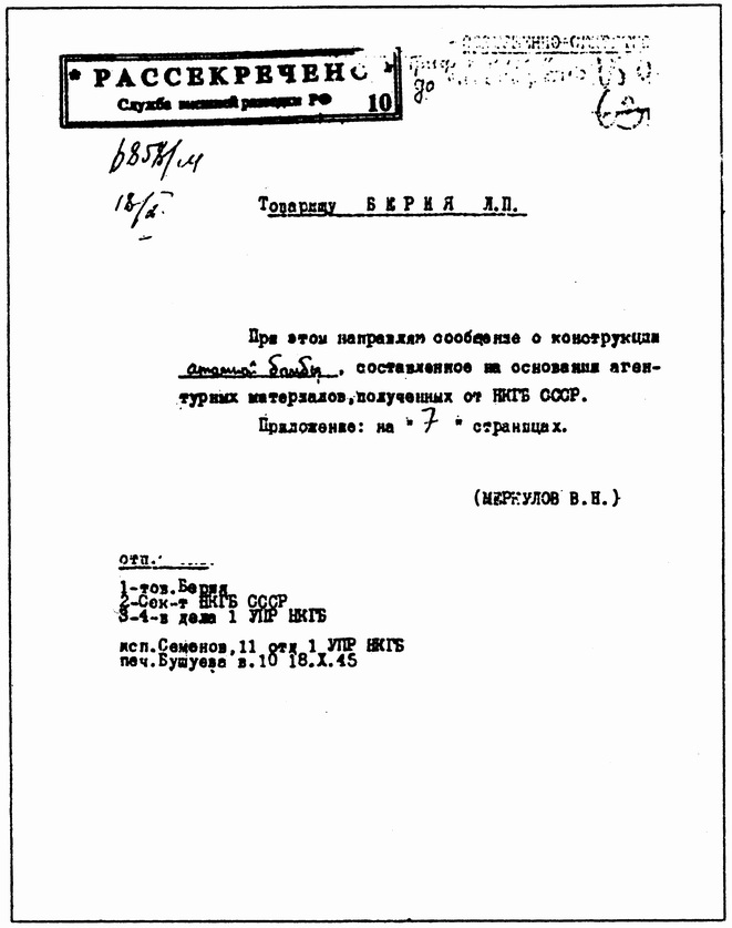 Фрагменты рассекреченных документов по урановому проекту, добытые советской разведкой. Из архивов НКВД-МГБ-КГБ СССР.