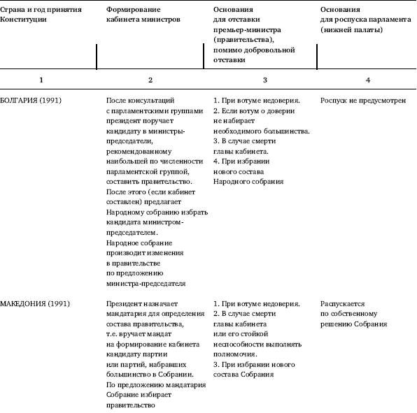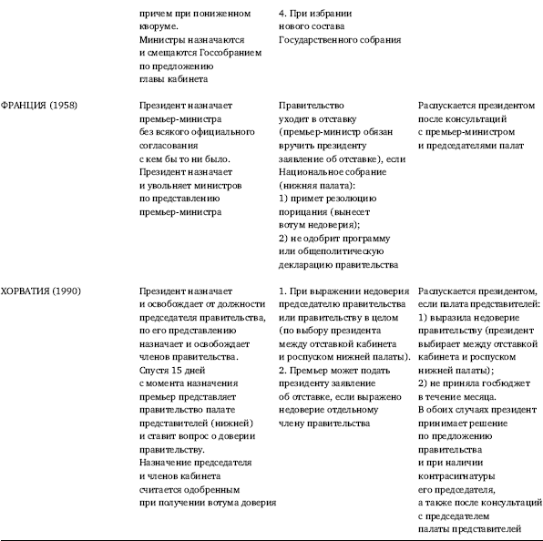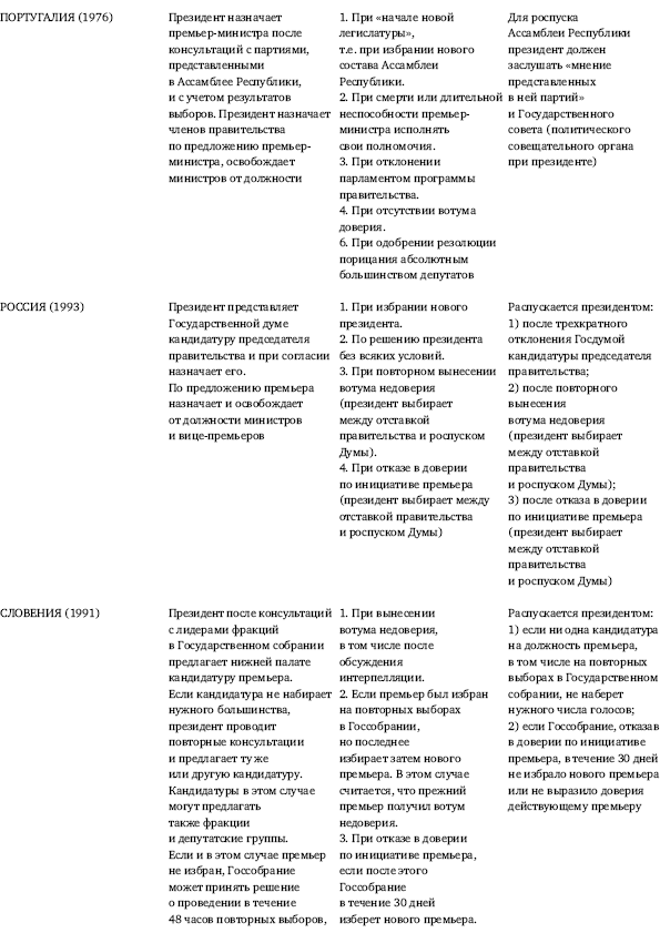 Из таблицы видно, что полупрезидентские республики Европы озаботились либо вообще недопущением роли президента как активного политического актора, либо сведением этой роли к сбалансированному минимуму. В одних странах (например, Португалия, Македония) президенту прямо предписано формировать правительство на основе итогов парламентских выборов; в других предусмотрены более тонкие механизмы, как в Хорватии или Польше, где почти сразу должно быть проведено голосование о доверии кабинету; в третьих всего этого нет, как во Франции, где даже не требуется согласия нижней палаты для назначения премьера, зато рычаги для отставки правительства находятся в руках либо премьер-министра, либо нижней палаты. И это не говоря уже о других полномочиях премьера, например его праве активно участвовать в принятии законов, обязанности контрасигновать некоторые акты президента и т. д.