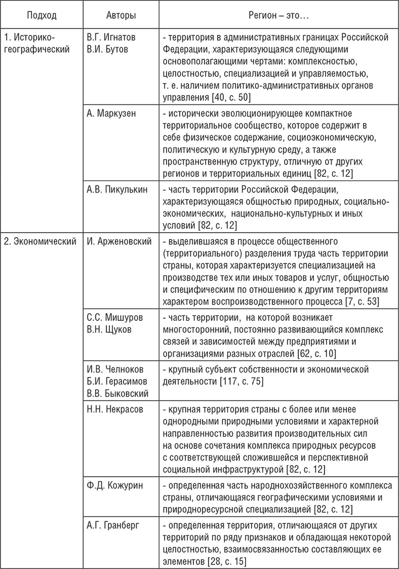 Существует множество подходов к определению научной категории «регион», что говорит о ее широте. Среди основных подходов следует выделить историко-географический и экономический (табл. 1). Одни ученые характеризуют регион как территорию с общностью географических, исторических и культурных условий; вторые – как территорию с общностью экономических условий, часть народнохозяйственного комплекса государства.