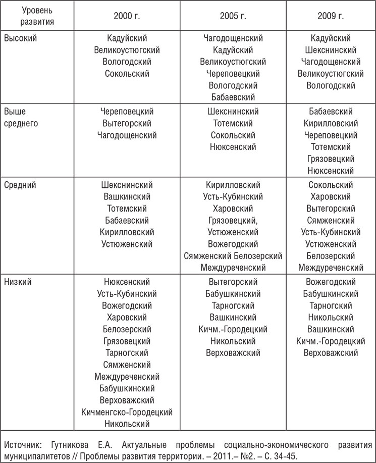 Муниципальные районы Вологодской области существенно различаются между собой по уровню социально-экономического развития. Для большинства характерна несформированность собственной финансово-экономической базы, что приводит к отсутствию прогресса в развитии территорий, сохранению отсталости экономики, к деградации социальной сферы, сокращению вложений в человеческий капитал и высокому уровню бедности жителей. Оценка дифференциации муниципальных районов на основе метода многомерного сравнительного анализа позволила выделить 4 группы районов: с высоким, выше среднего, средним и низким уровнем социально-экономического развития (табл. 2).