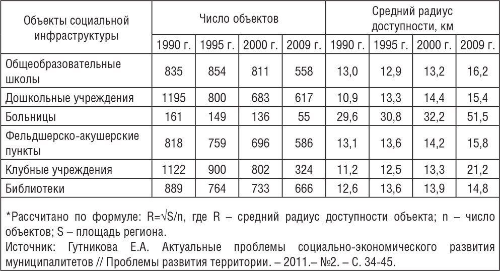 Как проблему в социальной сфере муниципальных образований можно выделить сокращение сети учреждений социального профиля, в результате чего ограничивается доступ жителей сельских поселений и малых городов к услугам образования и здравоохранения, услугам объектов культуры. Расчётные данные показывают, что только за период с 1990 по 2009 г. средний радиус доступности общеобразовательных школ увеличился в 1,3 раза, дошкольных учреждений – 1,4, больниц – 1,7, фельдшерско-акушерских пунктов – 1,2, клубных учреждений – 1,7, библиотек – в 1,2 раза (табл. 3).