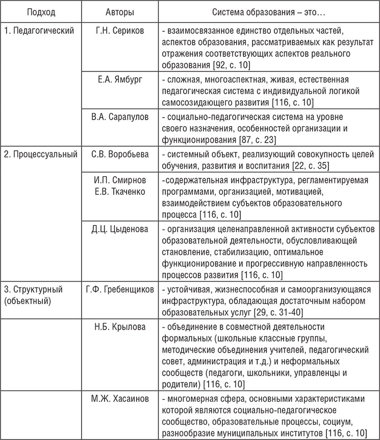 В таблице 4 приведены основные подходы к определению понятия «система образования».