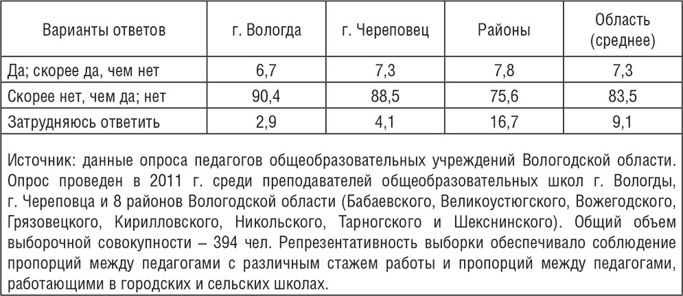 Таблица 6. Распределение ответов на вопрос: «Считаете ли Вы, что в прошлом году государство и муниципальные власти уделяли достаточно внимания проблемам школы и преподавателей?» (в % от числа опрошенных)