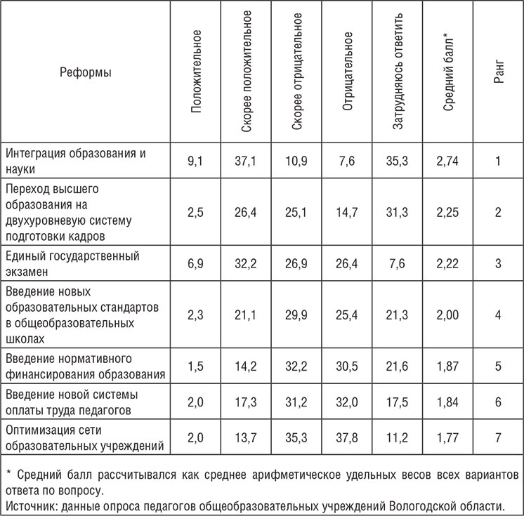Анализ социологических данных позволяет сделать вывод о том, что среди педагогов нет полного одобрения реформ, проводимых государством в системе образования. Позитивно воспринимает реформирование образовательной системы только треть учительского корпуса (27 %). На первом месте в рейтинге одобрения проводимых реформ стоит интеграция образования и науки, на последних – оптимизация сети образовательных учреждений и нормативное финансирование образования (табл. 8).