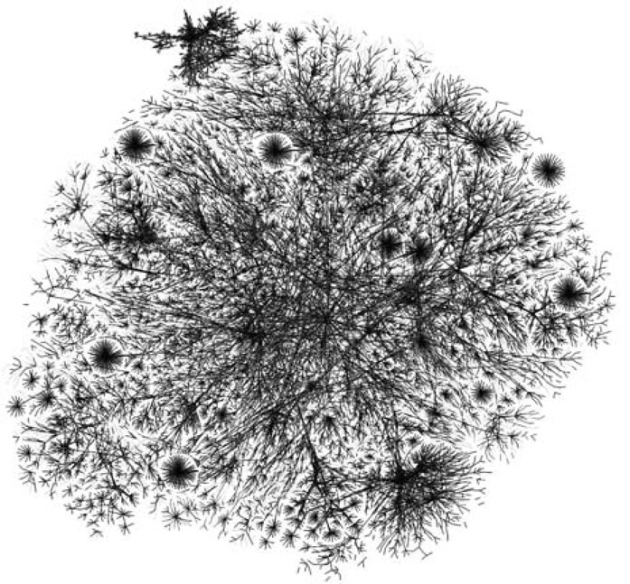 В соответствии с духом революции и историей всех прежних переворотов в способах коммуникации увлеченность, смешанная с возбуждением, подогревает смелые разговоры о преодолении телевидения, исчезновении печатных газет, вымирании бумажных книг и даже о конце грамотности в том виде, в каком она нам известна. В эпицентре этой революции – почти всеобщая уверенность в том, что время дефицита эфирных частот, массового широкого вещания, предсказуемых национальных аудиторий прайм-тайма прошло и что всему этому идет на смену изобилие частот, фрагментированное узкое вещание и менее предсказуемые аудитории «длинного хвоста»[1]. Революционная эпоха коммуникационного изобилия, символизируемая Интернетом, изображения которого сильно напоминают снежинки (илл. 1), структурируется новой мировой системой перекрывающихся и взаимосвязанных медиаустройств. Впервые в истории эти устройства, созданные на базе дешевых микропроцессоров, объединяют тексты, звуки и образы в цифровой, компактной, легко хранимой, воспроизводимой и транспортабельной форме. Коммуникационное изобилие позволяет отправлять и получать сообщения через многопользовательские интерфейсы в заданное время (как реальное, так и с отсрочкой) в рамках модульных, но в конечном счете глобальных сетей, которые доступны и в финансовом отношении, и физически нескольким миллиардам людей, рассеянным по всему земному шару.