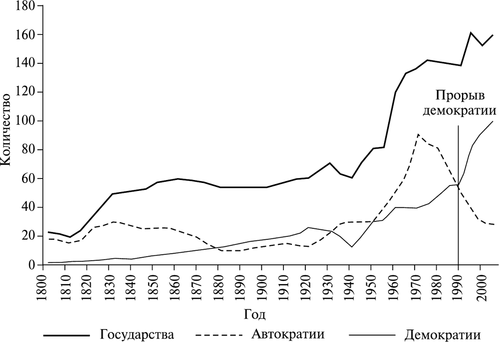 В 1989 г. впервые в мировой истории (не считая краткого периода после Первой мировой войны) число демократий, неуклонно увеличивавшееся с начала 1970?х годов, превысило число автократий. Действительно, данные проекта Polity IV указывают на то, что число «полных демократий» (full democracies) в мире возросло с 44 в 1985 г. до 93 в 2005 г. (см. рис. 1.1). За два десятилетия численность демократических режимов увеличилась более чем в 2 раза, в то время как количество автократий уменьшилось вдвое. Такое стремительное развитие представляло собой глобальную волну демократии.