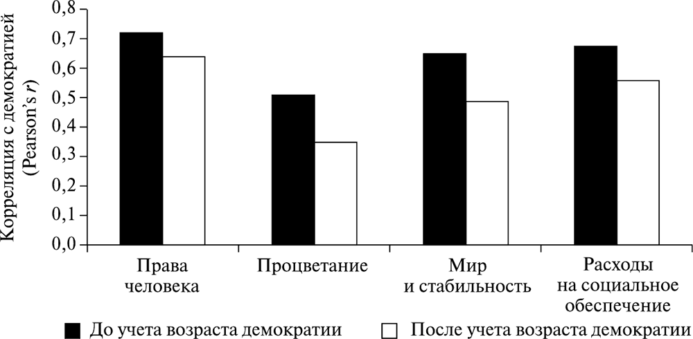 Примечание: Демократия – это комбинированный и инвертированный индекс Freedom House, усредненный за период 2000–2005 гг. Показатель «Права человека» измеряется индексом «Прав физической безопасности» за период 2000–2004 гг. Дэвида Сингранелли и Дэвида Ричардса (см.: <http://ciri.binghamton.edu>). «Процветание» измеряется как ВВП на душу населения по ППС за 2003 г. Источник данных – Всемирный банк. «Мир и стабильность» – это показатель «Политическая стабильность и отсутствие насилия» базы данных «World Governance Indicators» за 2005 г. «Расходы на социальное обеспечение» измеряются с помощью данных Всемирного банка о государственных расходах (на здравоохранение и сферу образования за минусом военных расходов). «Возраст демократии» измеряется индексом «запаса демократии» («democracy stock» index) Джона Герринга за 1995 г.[25].