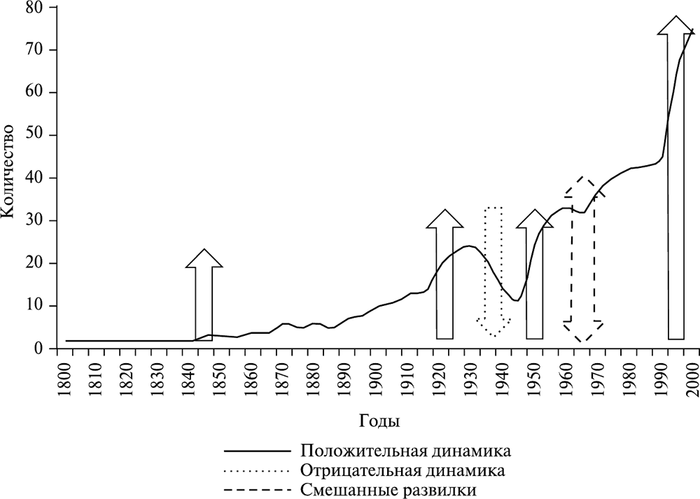 Рис. 4.2. Возникновение демократий в 1800–1998 гг.