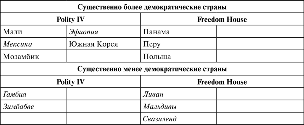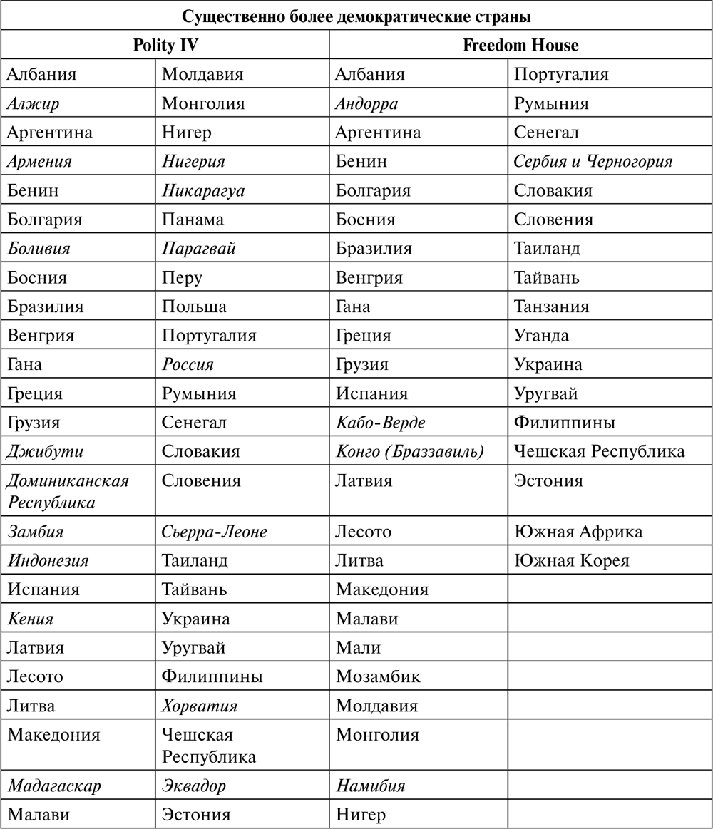 Примечание: Страна включается в список существенно более демократических или существенно менее демократических стран, если разность ее баллов по шкалам «демократии» и «автократии» по индексу Polity IV изменилась на величину, не меньшую 10, или если ее усредненный балл по шкалам политических прав и гражданских свобод Freedom House изменился на величину, не меньшую 2,5. Страны, которые включены только в один список, выделены курсивом.