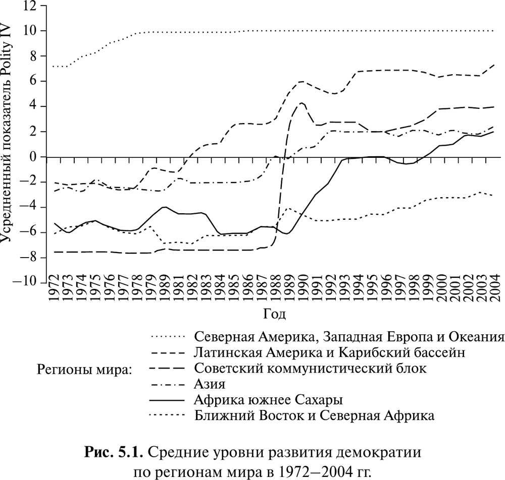 Рис. 5.1. Средние уровни развития демократии по регионам мира в 1972–2004 гг.