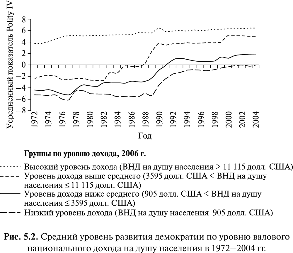 Рис. 5.2. Средний уровень развития демократии по уровню валового национального дохода на душу населения в 1972–2004 гг.