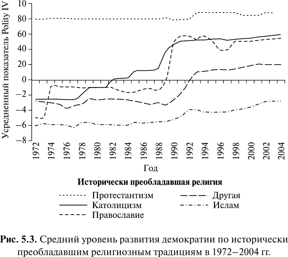 Что бросается в глаза при изучении графика на рис. 5.3, так это то, что в начале 1970?х годов страны, где исторически преобладал протестантизм, с очень высокой вероятностью получали высокие оценки уровня развития демократии (нужно помнить, что некоторые страны с высоким уровнем развития демократии, такие как Япония, Индия (большую часть рассматриваемого периода) и Израиль находятся в группе «Другие»). График также показывает, что в последующие десятилетия демократизация охватила страны с другими христианскими традициями, зато мусульманские страны демонстрировали малую вероятность демократизации.