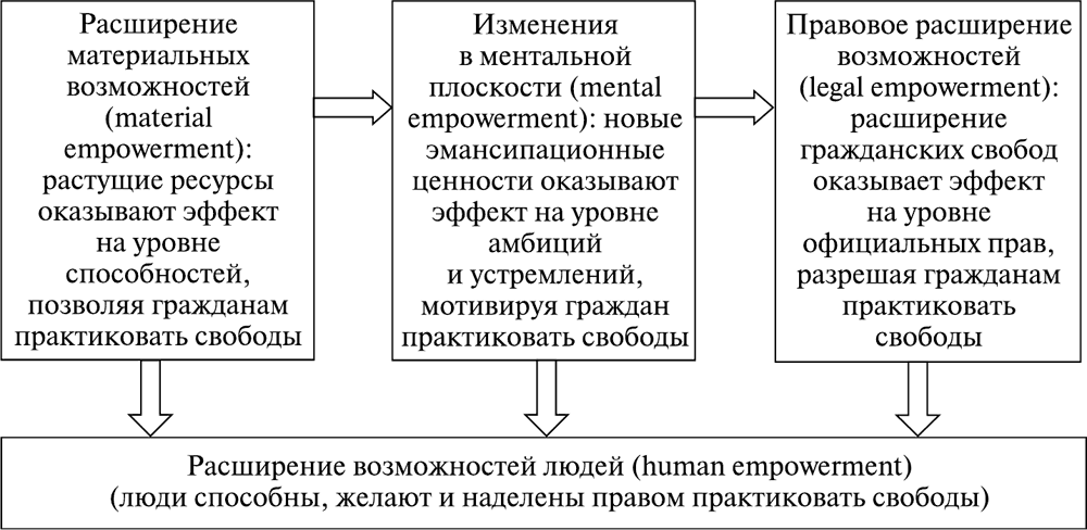 Борьба населения за демократию находит выражение в общественных движениях, активисты которых формулируют (frame) демократические цели и мобилизуют массы на поддержку этих целей в рамках кампаний по оказанию давления на элиты[302]. Если элиты не идут на уступки добровольно, предвидя эти массовые выступления, давление на них со стороны населения может вырасти настолько, что сопротивляться ему будет уже невозможно, и тогда элиты все же будут вынуждены уступить, либо вводя демократию, если ранее они правили авторитарным образом, либо углубляя ее, если ранее они блокировали соответствующие перемены. Эту последовательность Вельцель и Инглхарт[303] называют путем к демократии через расширение возможностей людей; он проиллюстрирован на рис. 6.2. Такой путь к демократии проходит в несколько стадий: 1) рост ресурсов, которые наделяют людей новыми возможностями в материальной плоскости, повышая их способность бороться за свободы; 2) распространение эмансипационных ценностей оказывает эффект в ментальной плоскости, мотивируя людей бороться за свободы; 3) сдвиги в правовой плоскости, когда граждане обретают права практиковать свободы.