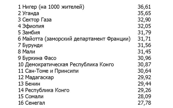 Лавинообразный рост народонаселения в бедных (африканских) странах не может оставлять равнодушным ни одного человека. Поскольку тема взрывоопасная, то вокруг цифр рождаемости, смертности, прироста населения ведутся ожесточённые споры. Тем более что часто речь идёт не о знакомой европейцам более-менее точной переписи населения, а об оценках. Поэтому обратимся к глубокому и беспристрастному источнику: ниже список стран с наибольшим приростом населения (рождаемость минус смертность) по данным ЦРУ за 2010 год: