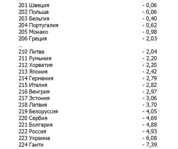 Для полноты картины приведём цифры из вымирающих стран – у них «прирост» отрицательный. Так выглядит конец списка: