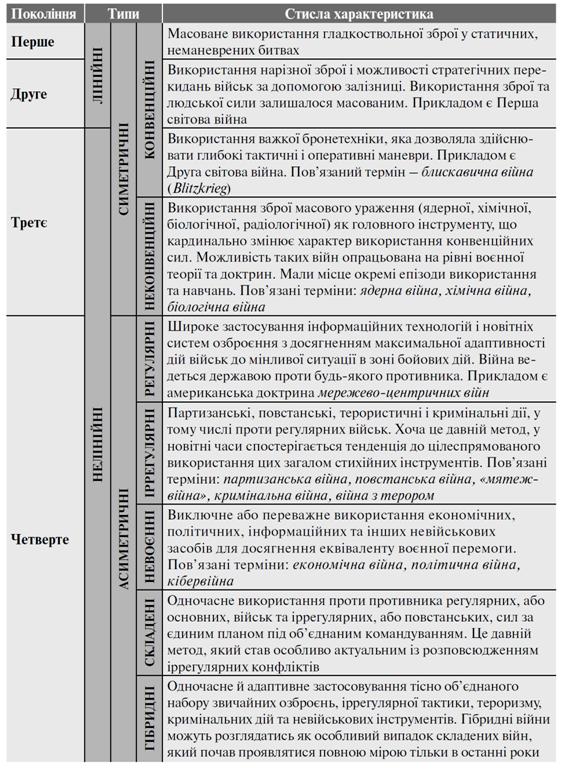 Як бачимо, майже всі визначення типів війни даються через основний метод або сукупність засобів її ведення. Через метод визначаються сутнісні характеристики: війна, в якій він застосовується, противник, який його застосовує, і загроза, яку цей метод несе. Важливо, що більшість визначень типів війн, які даються у такий спосіб, не виключають імовірності методологічної помилки. Абсолютизація методу здатна викривити розуміння конкретного виду війни. Крім того, виникає ситуація, коли воєнні дії, види загроз і противник-агресор об’єднуються за допомогою спільного означення від назви методу (напр. гібридна війна, гібридна загроза, гібридний противник) і можуть виступати, за певних умов, як недиференційовані сутності.