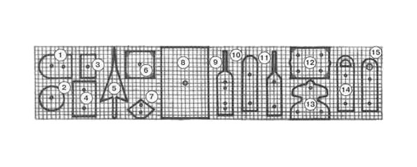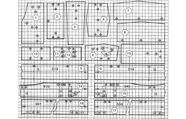 1 – Front-Pad auf dem Band 2 – Kreis zu dem Dekorelement (8), 3,4 – Auskleiden f?r Befestigungsgurt, 5 – Pfeil auf der Sch?rze (4), 6 – plaque Sch?rze (40), 7 – untere plaque Sch?rze (4 8) – Platten abdecken des Gurtbandes (12), 9 – Befestigung der Platten 14 und 15, in einem Winkel (6), 10 – Elemente von den Verbindungen der Schulter- und Beckenabschnitte der Panzerung: Oberseite von ihnen sind Drahthaken 11 – Befestigung der Platten 16 und 17 und niedriger als die unteren beiden Reihen (16), 12 – ?berspringen Fehler Illustrator 13 – overlay Schleife (16), 14 – vorderen Hakenschleifen Gurtteil der Panzerung (2), ein hinterer Scharnierhaken (4).