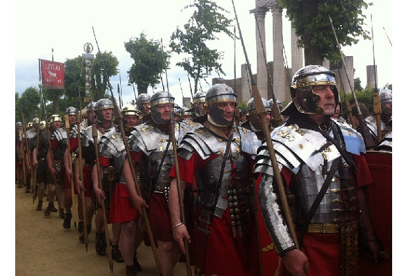 7. L?gion romaine (legionis – collection militaire) de l’apog?e de l’Empire. Reconstruction moderne. L’arm?e se compose de 5—7 mille, plus tard environ 4,5 mille unit?s d’infanterie et auxiliaires. Cavalerie lourde (actions) – 300 personnes, divis?es en divisions (turmas) pour 30 personnes. Archers – 200 personnes; Ils agissent ? partir des flancs, lib?rant des fl?ches le long de la ligne de boucliers sur?lev?s. Super – du lat. velox – “rapide” – plusieurs centaines de combattants – infanterie irr?guli?re, g?n?ralement recrut?e dans les tribus alli?es locales, ou les plus jeunes l?gionnaires. Armement – bouclier circulaire, diam?tre 90 cm, casque “Parma”, plusieurs fl?chettes “Gast velitaris” longue (avec une pointe de fer de 30 cm.) 120 cm et court (50 cm). ?p?e romaine – “Gladiateurs”. Le plus haut glamour d’un guerrier audacieux est la peau d’un loup sur son casque. La principale d?fense contre les fl?ches, et d’autres armes – leur propre agilit?. Dans un ordre ?tendu libre, ?vitant les missiles ennemis saute, les commandes pour lancer la lance de l’ennemi dans l’ordre et se retirant rapidement les rangs de l’infanterie lourde.