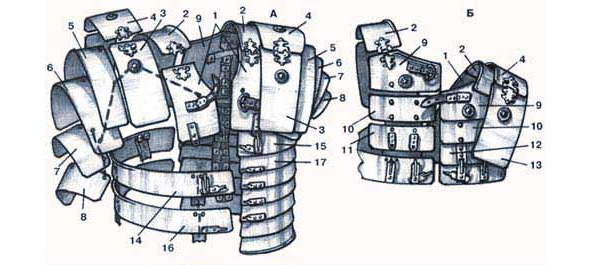 1 – patin avant de la sangle 2 – cercle de l’?l?ment d?coratif (8), 3,4 – Doublure pour sangles de fixation, 5 – fl?che sur le tablier (4), 6 – tablier de plaque (40), 7 – tablier de la plaque inf?rieure (4) 8 – plaques de recouvrement de la sangle de ceinture (12), 9 – fixer les plaques 14 et 15, suivant un angle (6), 10 – des ?l?ments des compos?s des parties d’?paulement et de recouvrement de l’armure:-dessus d’eux sont des crochets m?talliques 11 – fixation des plaques 16 et 17 et plus bas que les deux rang?es inf?rieures (16), 12 – sauter illustrateur d’erreur 13 – boucle de recouvrement (16), 14 – partie avant de la boucle d’accrochage de l’armure (2), une partie arri?re crochet de charni?re (4).