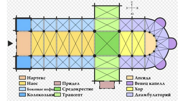 Transsept (du latin “pour” et “cl?ture”). Traverser la nef, traversant la nef principale principale ? angle droit, ? l’ext?rieur du b?timent principal formant des protub?rances – absides.