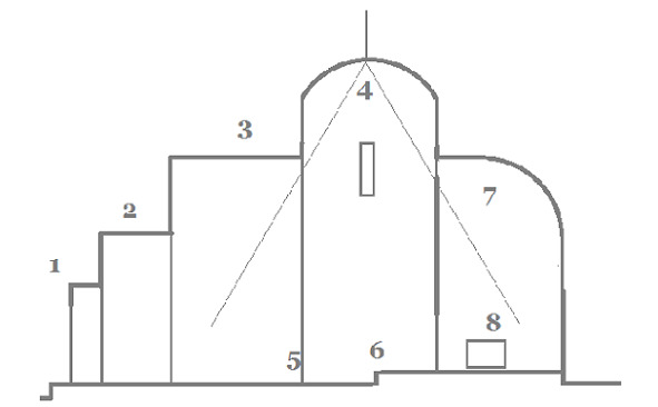 Narthex (le porche). Annexe devant l’entr?e du temple, checkpoint. Il est situ? sur le c?t? ouest du b?timent principal. La place habituelle pour les p?nitents, “? l'?coute” des rares, des h?r?tiques et des pa?ens.
