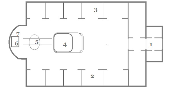 Nef (du latin navis – ship) – s?par?e par des colonnes, ayant la forme de rectangles allong?s, parties de l ‘int?rieur.