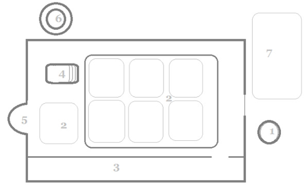 5) Dans certains cas, le bima a un passage cl?tur? ? l’arche de la synagogue (6), ou fusionne avec lui. Dans ce lieu sont situ?es des lampes.
