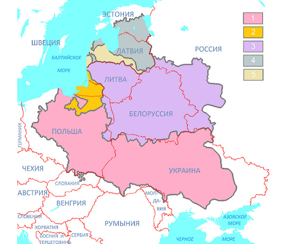 1. Rzeczpospolita (Ukraine d?pendante de la Pologne + Grand-Duch? de Lituanie) ? l’int?rieur des fronti?res de 1619 par rapport aux fronti?res des ?tats modernes. 1) Le Royaume de Pologne (Couronne), 2) Le duch? de Prusse est le vassal de la Couronne, possession de l’Ordre Teutonique. Avant cela, c’est le soi-disant. Fraternit? h?pital (devise: Aider, Protect-HEAL), a retir? de l’Ordre des Hospitaliers, d?g?n?r?e, presque en son contraire, attaqu? ? plusieurs reprises le duch? de Lituanie, mais, en 1410, a subi une d?faite ?crasante ? la bataille de Grunwald de la fronti?re polono-lituanienne (russe) troupes sous le commandement de Jagiello et son cousin Vytautas. 3) – Grand-Duch? de Lituanie, 4) Duch? de Livonie, la Lituanie et la copropri?t? de la Couronne, 5) Duch? de Duch? de Courlande, vassal de la Lituanie, de 1569 – Rzeczpospolita.