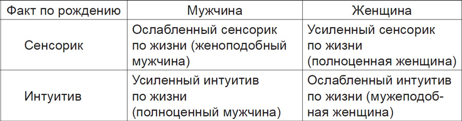 Таким образом, человек рождается дважды: сначала как мужчина или женщина из чрева матери, затем духовно как сенсорик или интуитив (примерно в 4–6 лет). Но рождённый мужчиной немного усиливает присущую ему интуитивность (законченный образ мужчины) и ослабляет присущую ему сенсорность. Рождённая женщиной немного усиливает присущую ей сенсорность (законченный образ женщины) и ослабляет присущую ей интуитивность (см. табл. 1).