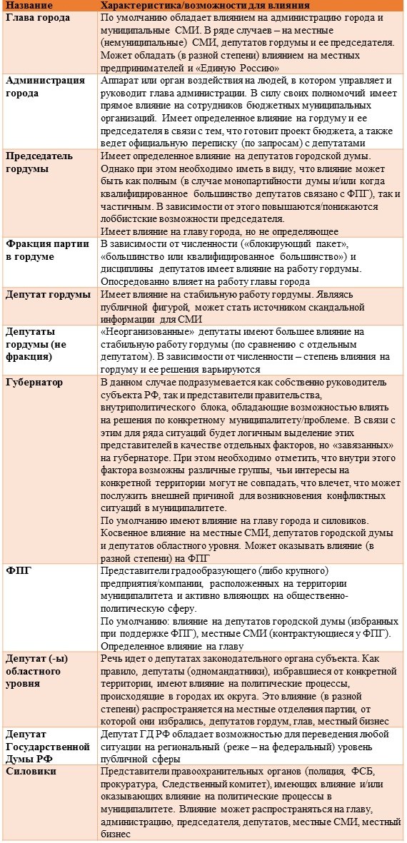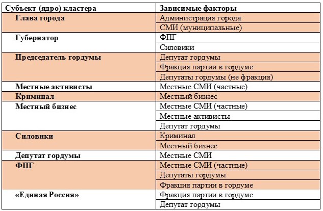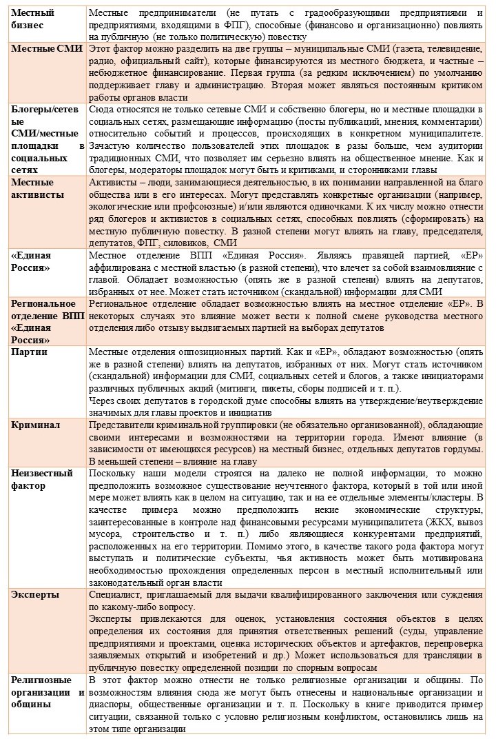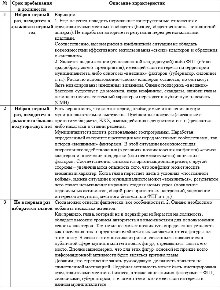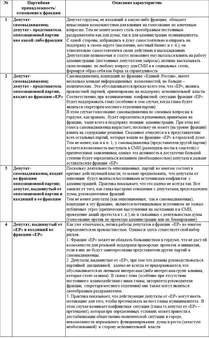 Наш анализ показал необходимость более детализированного описания глав и депутатов гордумы. В частности, возможности главы муниципалитета во многом определяются сроком, который он находится в своей должности. Что касается местных депутатов, то здесь в качестве значимого фактора мы определили его партийную принадлежность и вхождение/невхождение во фракцию.