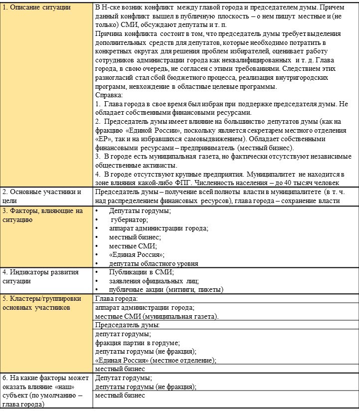 В детских конструкторах при наличии стандартного набора элементов дается инструкция по тому, как из них можно собрать ту или иную фигуру, машину и т. п. В сущности, представленный ниже анализ типовых моделей подразумевает то же самое. Есть конфликтная ситуация, которая анализируется с помощью стандартных элементов. В зависимости от специфики конфликта и сценарных задач формируются прогнозы развития, на основе которых разрабатывается сценарий действий.