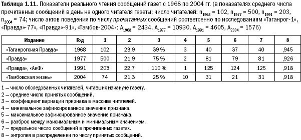 Но вот что интересно. В 1968, 1977, 1991, 2004 гг. мы исследовали реальное чтение разных газет населением. Оказалось, что ежедневно к газетному листу обращается около 40 % читающей массовую прессу публики. И вот среди этих читателей среднее число сообщений на одного читателя, как уже указывалось, оказалось постоянным.