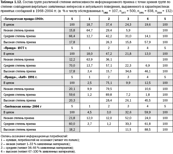 В 1973 г. были обнаружены группы по степени осознания своих информационных потребностей. Дело в том, что определенная социология умело проводит исследования там, где можно взять деньги, абы сказать, что хочет услышать барин. Исследования массовых коммуникаций задавали дежурный вопрос о тематических интересах аудитории, а затем писались рекомендации по сетке вещания или наполнению газетной полосы. Автор книги еще в 1973 г. сопоставил на 4546 актах реального прочтения газетных сообщений совпадение заявленного читателем интереса и характеристик прочитанных, просмотренных и пропущенных сообщений. Методика была повторена в 1977 г. на 35 000 актах приема, в 1991 г. – на 63 000 актах приема информации «АиФ», «Правды» и «Комсомольской правды» и в 2004 г. – на 3546 актах приема сообщений «Тамбовской жизни». Если человек на основании нескольких вопросов называл темы, качества, свойства материалов, которые он предпочитает читать, то это фиксировалось. Процедура выяснения реального чтения газет вела к отметке прямо на газетном листе прочитанных, просмотренных и пропущенных материалов[33]. Затем (в 1973 г. вручную, а позднее на ЭВМ) характеристики материалов, полученные с помощью контент-анализа, в каждом случае прочтения или отказа от чтения сопоставлялись с заявленными интересами. Выяснялась доля читаемых сообщений в общем числе совпадений двух рядов характеристик. Объективная потребность выражена в действии по прочтению. Субъективно осознанная заявлена вербально. Были обнаружены четыре группы читательской аудитории: