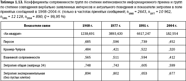 Характерным обстоятельством, вытекающим из дополнительных данных, является то, что уже в 1968 г. среднее число сообщений, рассмотренное в рамках групп, различающихся активностью в структуре информационно-политических процессов и дифференцирующихся по профессиональной принадлежности и по образованию, совершенно одинаково. Если мы введем в дифференцирующуюся по указанной активности структуру формы межличностной коммуникации (обмен мнениями в бытовой микросреде, семье, производственной общности), то отклонение в средней незначительно возрастет в наиболее активной группе (в 80 %-м интервале до 29,6 принятых на читательскую душу сообщений). При этом среди мало– и средневключенных в массовые формы идеологического процесса средняя не падает. Это значит, что процесс приема сообщений принял уже 40 лет назад массовый характер и читатель совершенно свободно вел себя на рынке сообщений, выбирая в той или иной жизненной ситуации любую качественную информацию, необходимую ему и мало соответствующую заявленным интересам, на которые ориентировались редакции. В то время рынок сообщений сложился, а рынок товаров, как мы вскользь пока рассмотрели, был стандартизован и узок по ассортименту товаров широкого народного потребления и товарному покрытию рубля. Однако теперь дело зеркально изменилось. Насыщенность товарами перекрывает платежеспособный спрос широких слоев населения, а рынок сообщений резко ограничен набором содержательных элементов социальной информации, отражающей жизнь страны. Это видно уже невооруженным взглядом, но мы впоследствии покажем это на данных анализа содержания ведущих газет России.