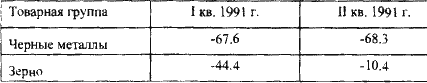 Изменения объёмов импорта СССР по важнейшим товарным группам в I и II кварталах 1991 г. относительно соответствующих периодов 1990 г., %