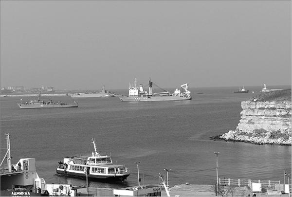 Транспорт вооружения «Генерал Рябиков», килекторное судно КИЛ-158 и тральщик «Турбинст» блокируют Севастопольскую бухту.