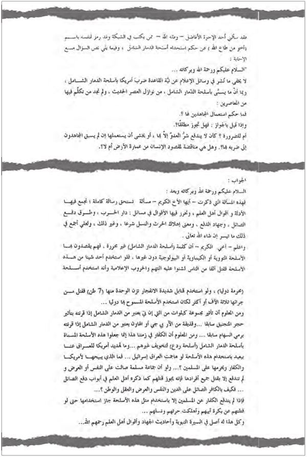 Еще одна фетва, найденная в архивах Бен Ладена, захваченных в Абботтабаде. Этот текст саудовского проповедника по имени Насер бен Хамад аль-Фахд (Nasir bin Hamad al-Fahd) позволяет джихадистам прибегать к помощи ядерного оружия.