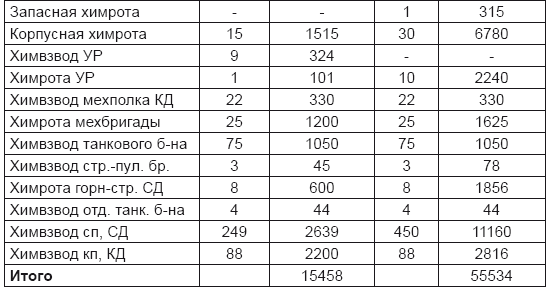 а) отдельную химическую (смешанную) бригаду иметь в составе четырех батальонов… общей численностью 2200 человек, 100 танков и 90 минометов. Основное назначение бригады — нанесение химических и огневых ударов боевым порядкам противника на фронте и его резервам в глубине;