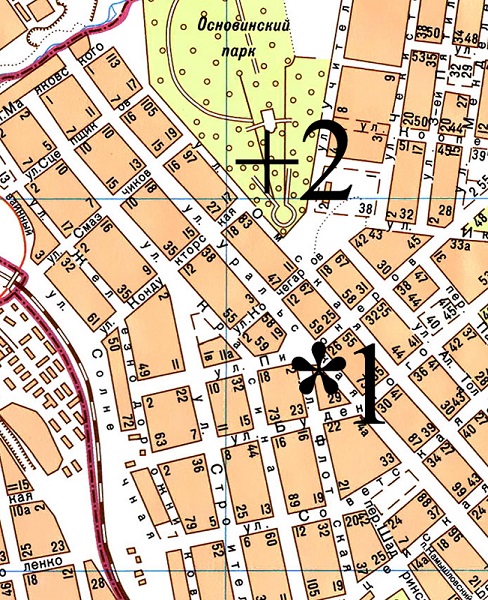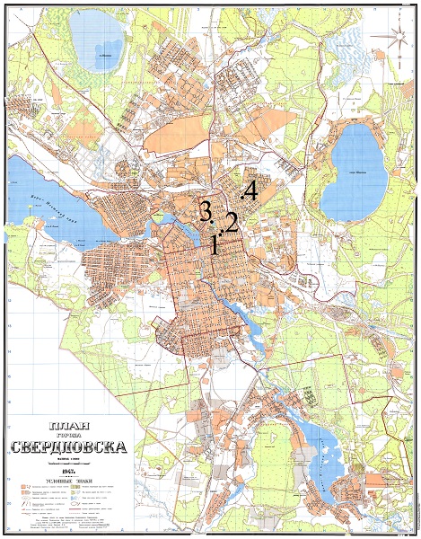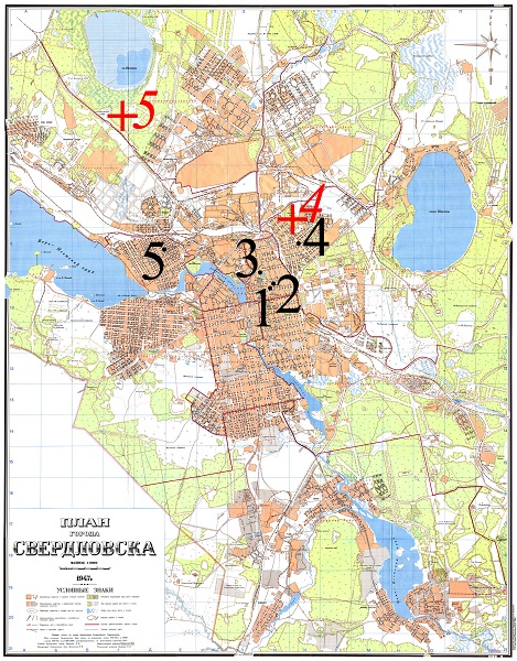 Карта Свердловска с указанием мест исчезновений детей по состоянию на конец июня 1939 г. Обозначено: 1 – похищения 12 июля 1938 г. Герды Грибановой; 2 – попытки похищения 10 февраля 1939 г. Бори Титова; 3 – покушения на убийство 1 мая 1939 г. Раи Рахматуллиной; 4 – похищения 12 июня 1939 г. Али Губиной; 5 – похищения 30 июня 1939 г. Риты Ханьжиной. Расстояния от 5 до 3 примерно равно 3,2 км, а от 5 до 1 – около 3,6 км. Бросается в глаза то, что после первых нападений, зафиксированных в центральной части Сталинского района, преступник ожидаемо начал расширять зону своей активности.