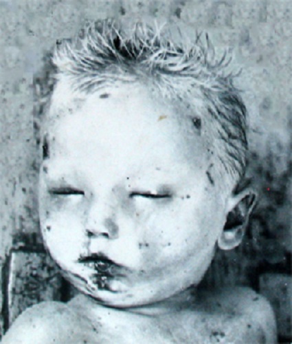 – на лбу круглое отверстие диаметром 0,5 см, из которого выходят личинки мух. Это тоже важный признак, несущий информацию о давности смерти. Мухи устремляются к мёртвому телу в первые же часы с момента умирания, ориентиром им служит весьма специфическая комбинация газов, выделяемых телом умершего, причём этот запах они способны почувствовать на удалении до полутора километров. Мухи разных видов демонстрируют просто поразительную тонкость обоняния, оставляя далеко позади не только людей и собак, но и других насекомых. Обнаружив труп, они спешат отложить личинки в открытые отверстия и раны, при этом целостную кожу мухи повредить не могут, в отличие от таких разрушителей трупов, как жуки и лесные клещи. То, что на лбу девочки имелось отверстие, из которого выходили личинки мух, означало, что данное повреждение является прижизненным, но судмедэксперт Грамолин никакого заключения на этот счёт в июле 1939 г. не сделал;