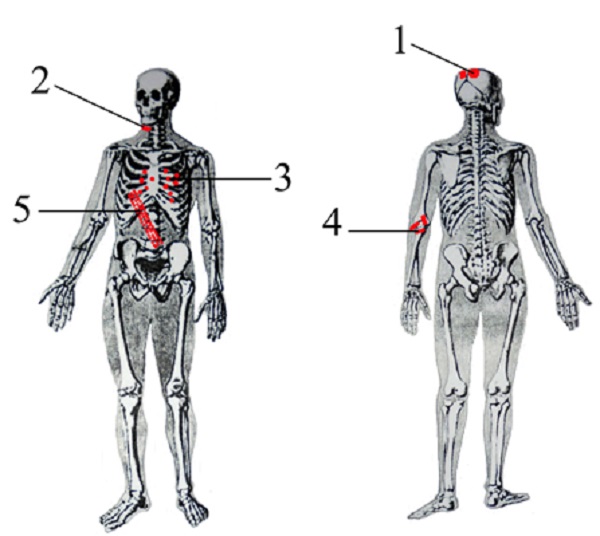 – На голове в области левого теменного бугра, правой теменной области и в затылочной области кровоизлияния размером 2 см х 2 см, 1 см х 2 см и 0,5 см х 1 см соответственно (поз.1). Кости черепа целы. Наличие кровоизлияний свидетельствует о прижизненных ударах в затылочную часть головы, удары эти были нанесены не с очень большой силой, и хотя были болезненны, не вызвали серьёзных повреждений;