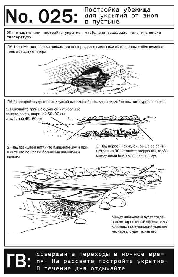 В условиях пустыни защита от влаги обычно не представляет никаких проблем, и поэтому будет вполне достаточно, если найденное вами укрытие обеспечит вас лишь тенью, а не будет полностью закрытым. В этом качестве вас вполне устроит место среди скал, где дует прохладный ветерок. Однако в песчаной пустыне эффективное укрытие может быть устроено прямо на песке с помощью всего лишь двух плащей-накидок или кусков брезента, а также лопаты. В крайнем случае его можно сделать даже голыми руками.