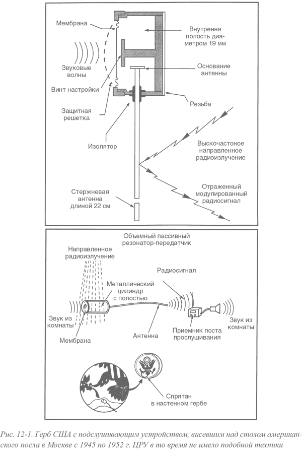 Однако устройство, которое висело над столом американского посла в 1952 г., было настоящей революцией в технике подслушивания. Оно было внедрено в середину деревянного герба, в специально вырезанную нишу, имевшую тщательно скрытое акустическое отверстие, выходившее в ноздри орла, расположенного на лицевой поверхности американского герба. Это новейшее устройство, которое долго не могли обнаружить, вызывало особую тревогу, поскольку использовалось против американцев более пяти лет. И действительно, четыре американских посла – Аверелл Гарриман, Уолтер Смит, Алан Кирк и Джордж Кеннан вели свои секретные беседы рядом с техникой подслушивания.