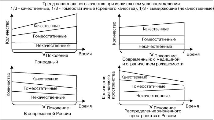 Национальный биологический материал постоянно совершенствуется — это и есть жизнь нации. Так получилось, так происходит в результате свободного выбора варианта. Когда отбор работает, дети рождаются в массе здоровыми и нормальными, по вышеприведенной методологии — качественными. А в результате отбора искусственного или ограниченного неприродными рамками (например, в результате браков династических или по расчету) получаются люди качеством на порядок ниже.