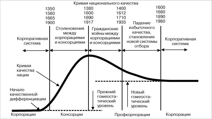 Общественная модель — система координат, без которой немыслимы серьезный анализ и направленный поиск. Есть жизненное пространство, есть и субъекты истории, на нем действующие. Этногенез — слишком масштабно; наши герои — корпорации, профкорпорации, консорции — небольшие группы, сменяющие друг друга в управлении нацией и ее институтами. Консорция — собрание людей, имеющих общие черты в образе жизни, общие методы в борьбе за жизненное пространство. В перспективе может развиться в нацию, но чаще в ней растворяется. Консорции возникают при нехватке жизненного пространства, при масштабных переселениях, и ведут борьбу за его передел или освоение. Примеры: раскольники, вольные казаки, революционеры, землепроходцы, конкистадоры. Путь в консорцию открыт каждому: она ведет войну. Профкорпорации (в т. ч. сословие или его часть) — собрания людей, объединенных сходной групповой моралью, этическими нормами, контролирующими и защищающими захваченную нишу жизненного пространства, для чего отбирающих в свою среду наиболее «достойных». Примеры: варяги, стрельцы, казаки на службе, коммунисты 40-х — 70-х годов, таксисты, шахтеры, переводчики на Западе. Иногда используют наемников.