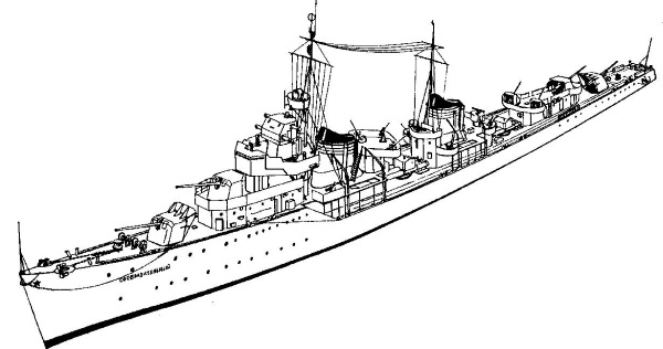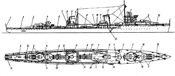 1 – кормовой флагшток; 2 – шпиль; 3 – 130-мм орудие; 4 – 76-мм орудие; 5 – командно-дальномерный пост; 6– торпедный аппарат; 7 – воздухозаборник; 8– прожектор; 9– дымовая труба; 10– параван; 11– катер; 12 – якорный шпиль; 13 – забортный трап; 14 – глубинные бомбы; 15 – вьюшка;16 – подкрепление под зенитную артиллерию; 17– сходный люк; 18 – рельсовый минный путь