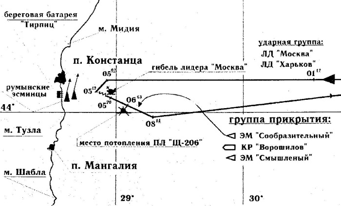 Румынское командование на радостях объявило, что лидер «Москва» потоплен из румынских береговых торпедных аппаратов, находившихся у входа в Констанцу. Немцы в ответ только посмеялись глупости румынского начальства – как могли торпеды пройти путь в 180–190 кабельтовых – и, в свою очередь, приписали гибель лидера 28-см (283-мм) орудиям береговой батареи «Тирпиц». Вскоре на стволах ее орудий появился силуэт советского корабля.